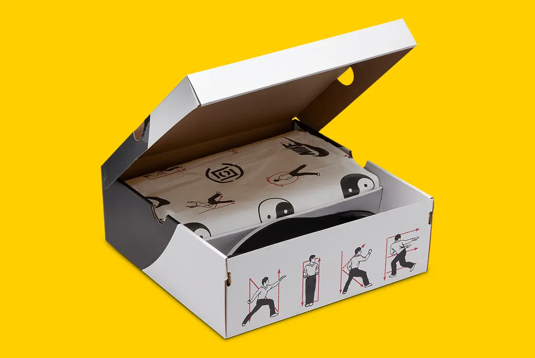 Gli appasionati di cinema si saranno subito accorti che la colorazione è ripresa da quella della tuta indossata dall’attore nel film del 1979 “Game Of Death“. I richiami alla cultura asiatica, poi, sono presenti nel back della scarpa, sia sui lacci della tomaia esterna sia sul cuoio della tomaia interna. Simboli e richiami presenti anche sulla soletta interna e nel box, con tanto di Bruce Lee che si cimenta in pose da Kung-Fu.