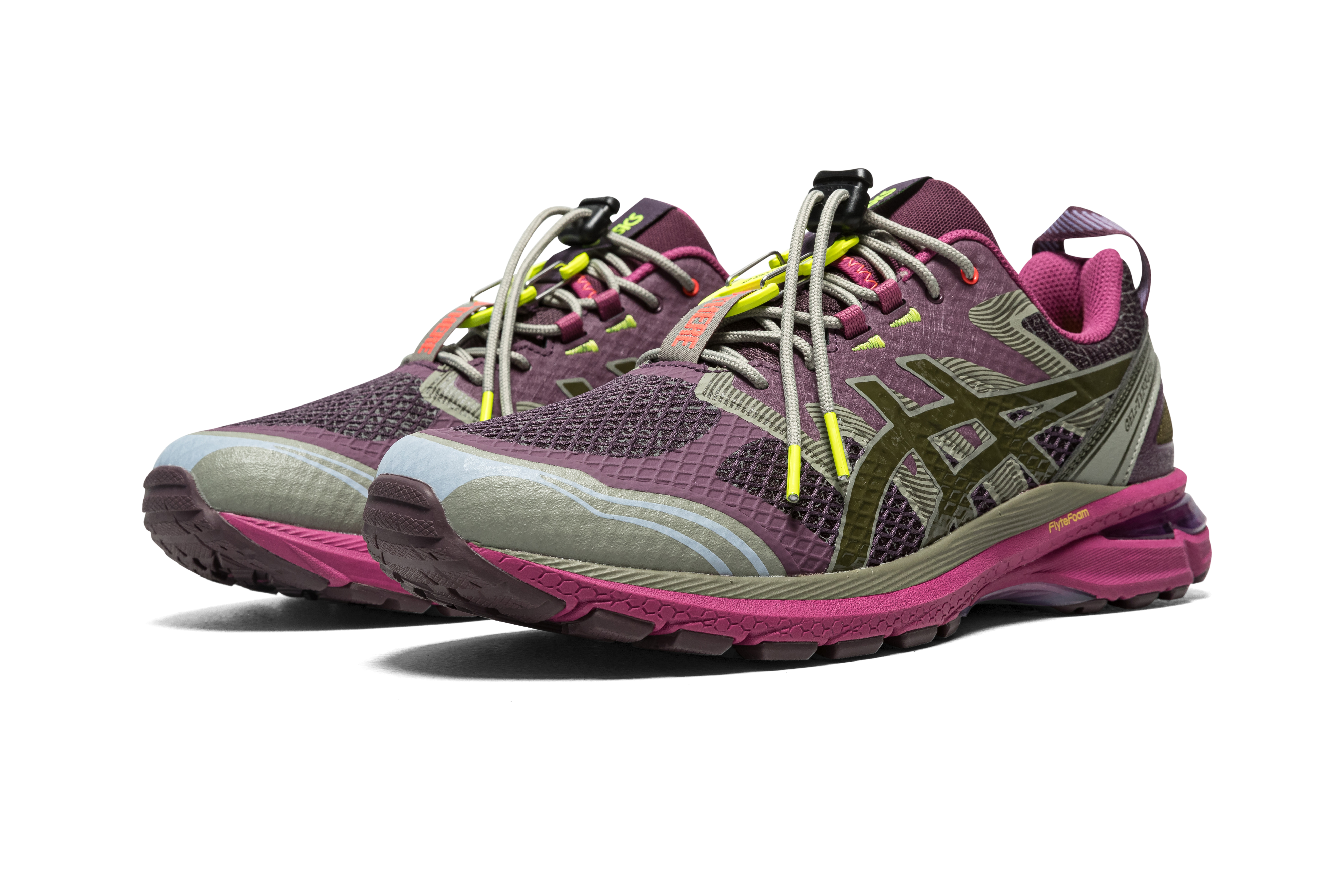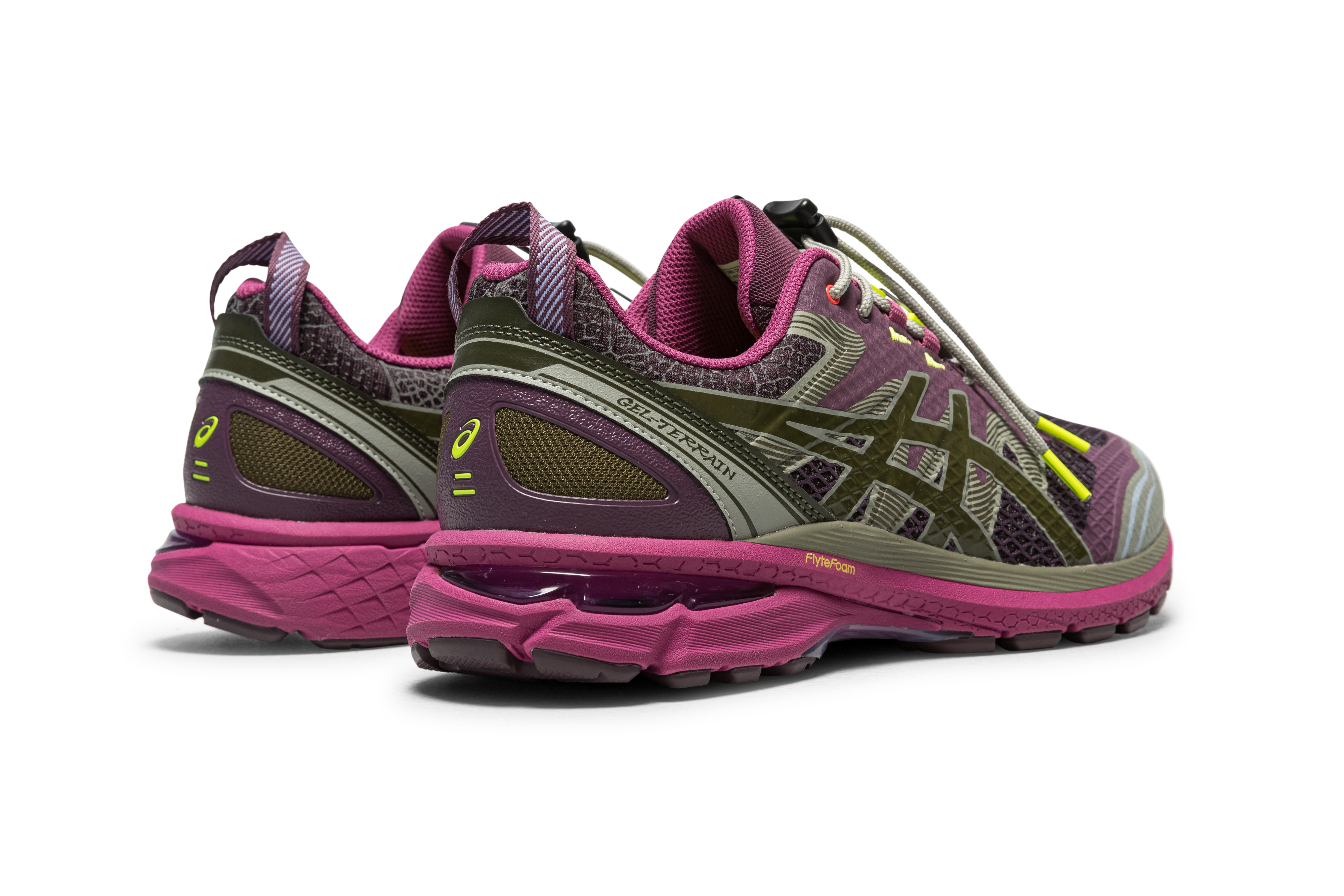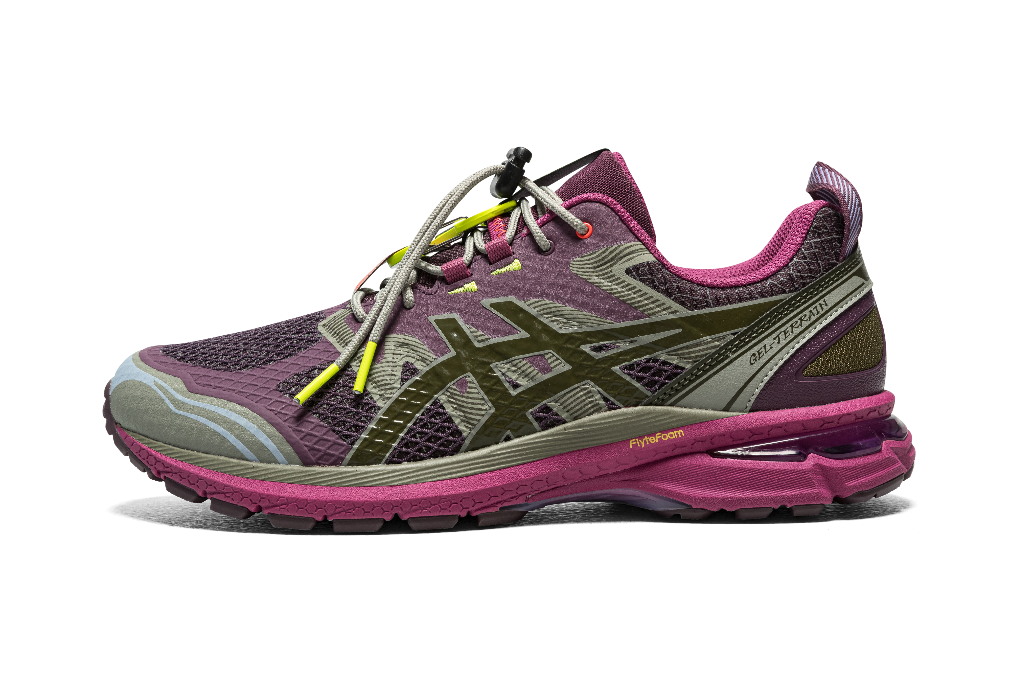 Come per la GEL-TERRAIN™, la versione UP THERE x ASICS GEL-TERRAIN™ è dotata di ammortizzazione FLYTEFOAM™ per offrire una sensazione di energia, combinata alla tecnologia GEL™, posizionata nella zona anteriore e posteriore del piede, per ottenere un migliore assorbimento degli impatti. Un moschettone a S, dal color giallo vivace, collega le due linguette ai lacci, disponibili in tre varianti colore: lavanda, rosa scuro e grigio.