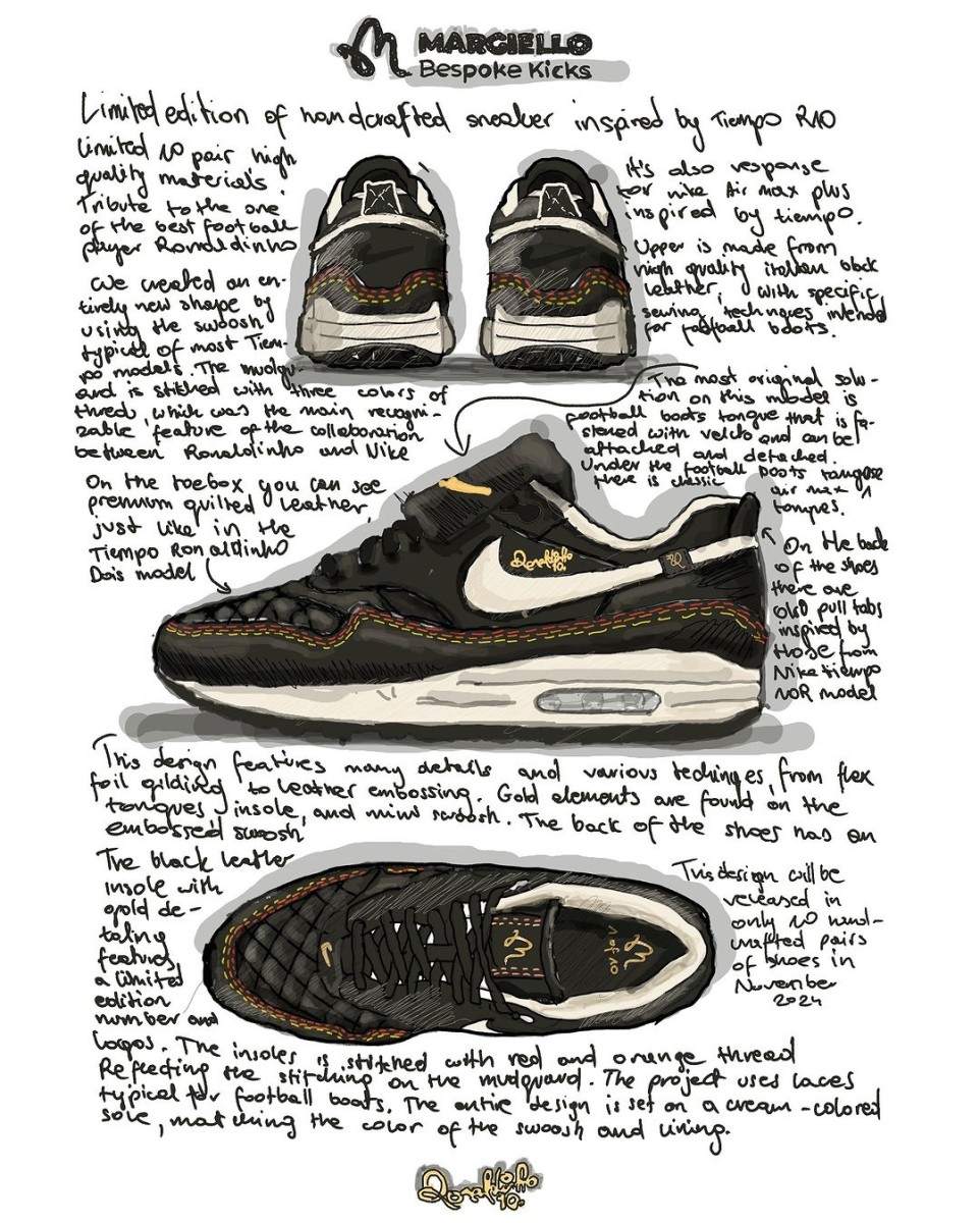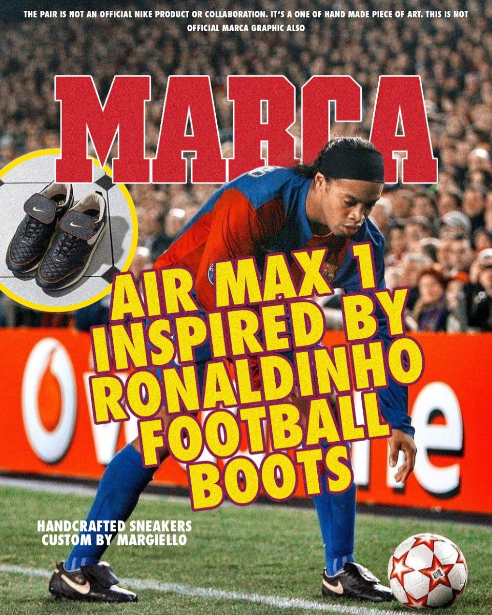 Questa sneaker, una Air Max 1 personalizzata, non è un prodotto ufficiale Nike, ma un autentico capolavoro artigianale. Il progetto è un tributo al design e alla qualità delle scarpe da calcio di quegli anni, diventate simbolo di eleganza e performance sul campo. Con dettagli che richiamano le calzature indossate dai campioni brasiliani, la Football Nostalgia cattura l’essenza di un periodo in cui il calcio era pura arte.