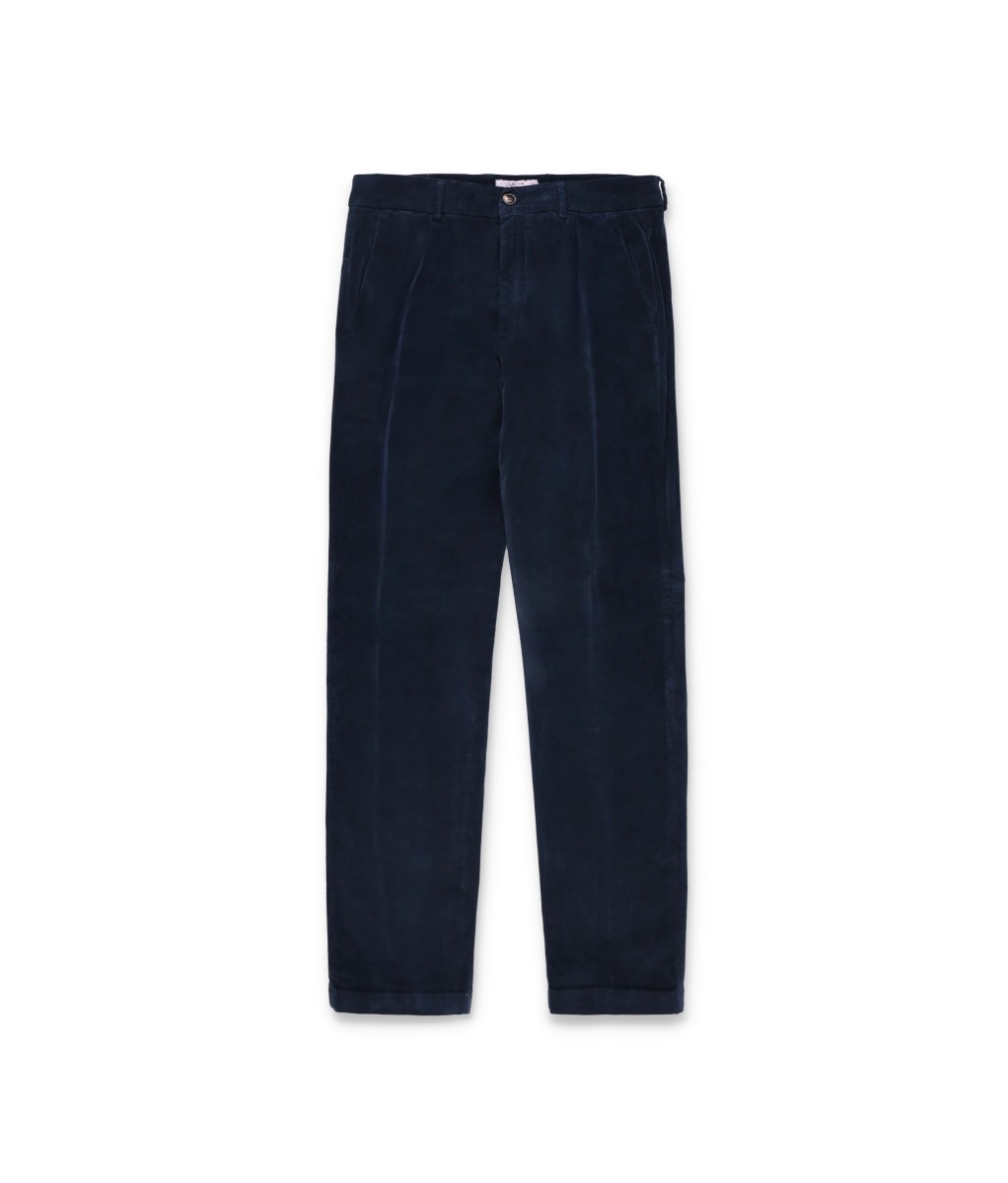 • Blazer Portland: revers a lancia in jersey di lana micro-fine, abbinato al pantalone Kensington, in velluto liscio disponibile in bordeaux, verde scuro e blu notte.