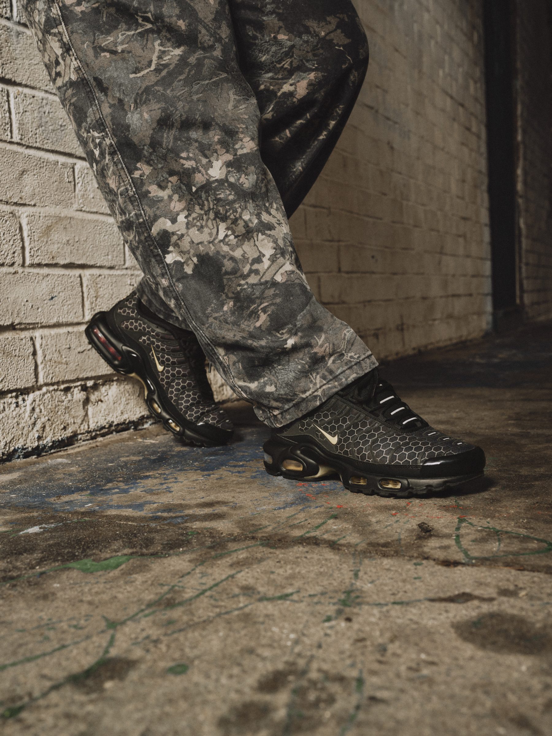La colorazione è dominata da una base nera intensa, attraversata da dettagli beige chiaro, gesso e marrone che costruiscono un equilibrio sofisticato ma urbano. È una palette che richiama il mattone industriale, le strade umide, le architetture post-industriali che hanno definito l’estetica della città. Ma il cuore narrativo della sneaker è l’ape. Simbolo ufficiale di Manchester fin dall’epoca della Rivoluzione Industriale, l’ape rappresenta operosità, resilienza e unità. Dopo gli eventi tragici del 2017, è diventata anche emblema di solidarietà collettiva. Inserirla in questa Air Max TN significa trasformare la scarpa in un oggetto identitario. Il pattern a nido d’ape attraversa tomaia, suola e tallone con una coerenza grafica che non è semplice decorazione, ma struttura visiva. È un elemento che dialoga perfettamente con le linee organiche della Tn, enfatizzandone le ondulazioni laterali. All’interno della linguetta, l’ape ricamata come dettaglio nascosto è una dichiarazione per chi conosce davvero la città. Non è branding superficiale: è insider culture.