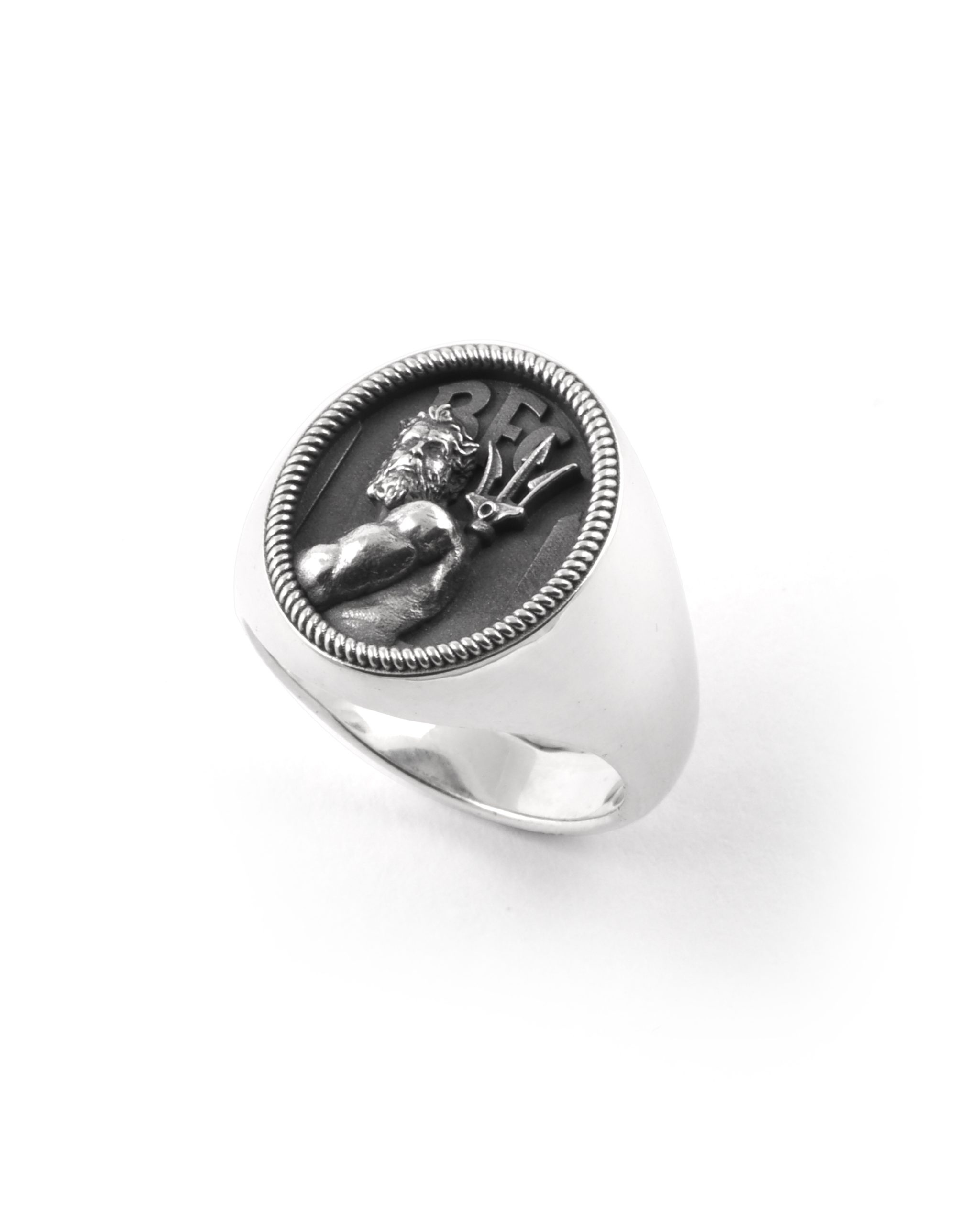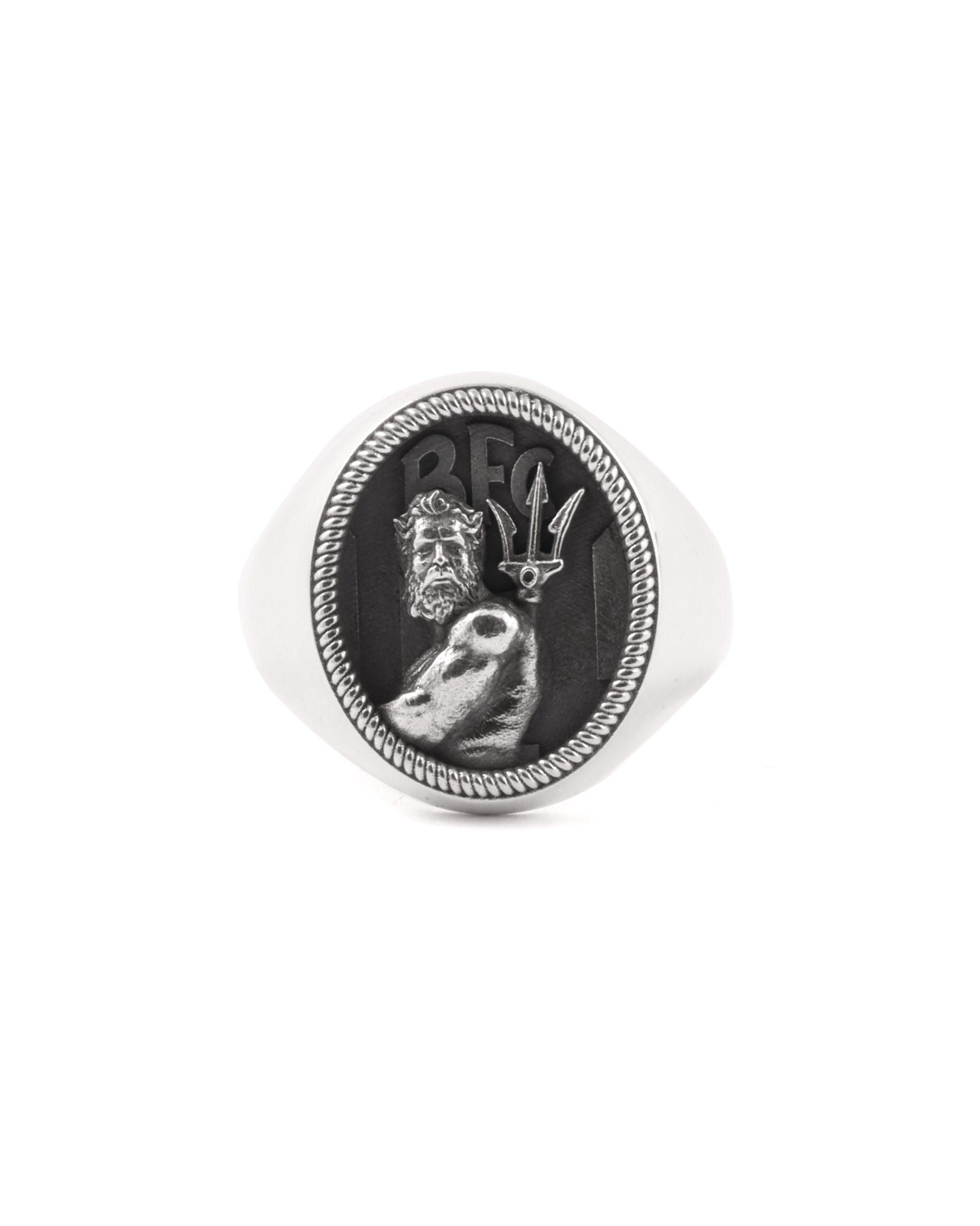 Al centro della collezione si trova lo Chevalier Ovale Nettuno, un sigillo in argento brunito che incarna l’orgoglio bolognese. Il bassorilievo del dio Nettuno si fonde con il logo del Bologna FC, incorniciato da una decorazione a corda che richiama l’abbraccio dei tifosi alla squadra. Questo anello, personalizzabile, permette a ogni appassionato di esprimere il proprio legame con i colori rossoblù.