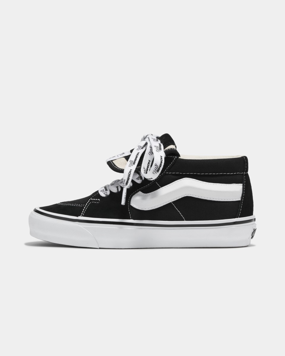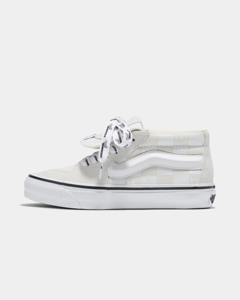 - Calzature: Una versione personalizzata delle OTW Sk8-Mid 83, con tomaia in suede e tela di alta qualità. La caratteristica Sidestripe è stata ingrandita e la linguetta allungata per un look audace. Disponibile in due varianti di colore – bianco e nero – la versione bianca presenta anche il logo HG intrecciato nel classico motivo a scacchi Vans.