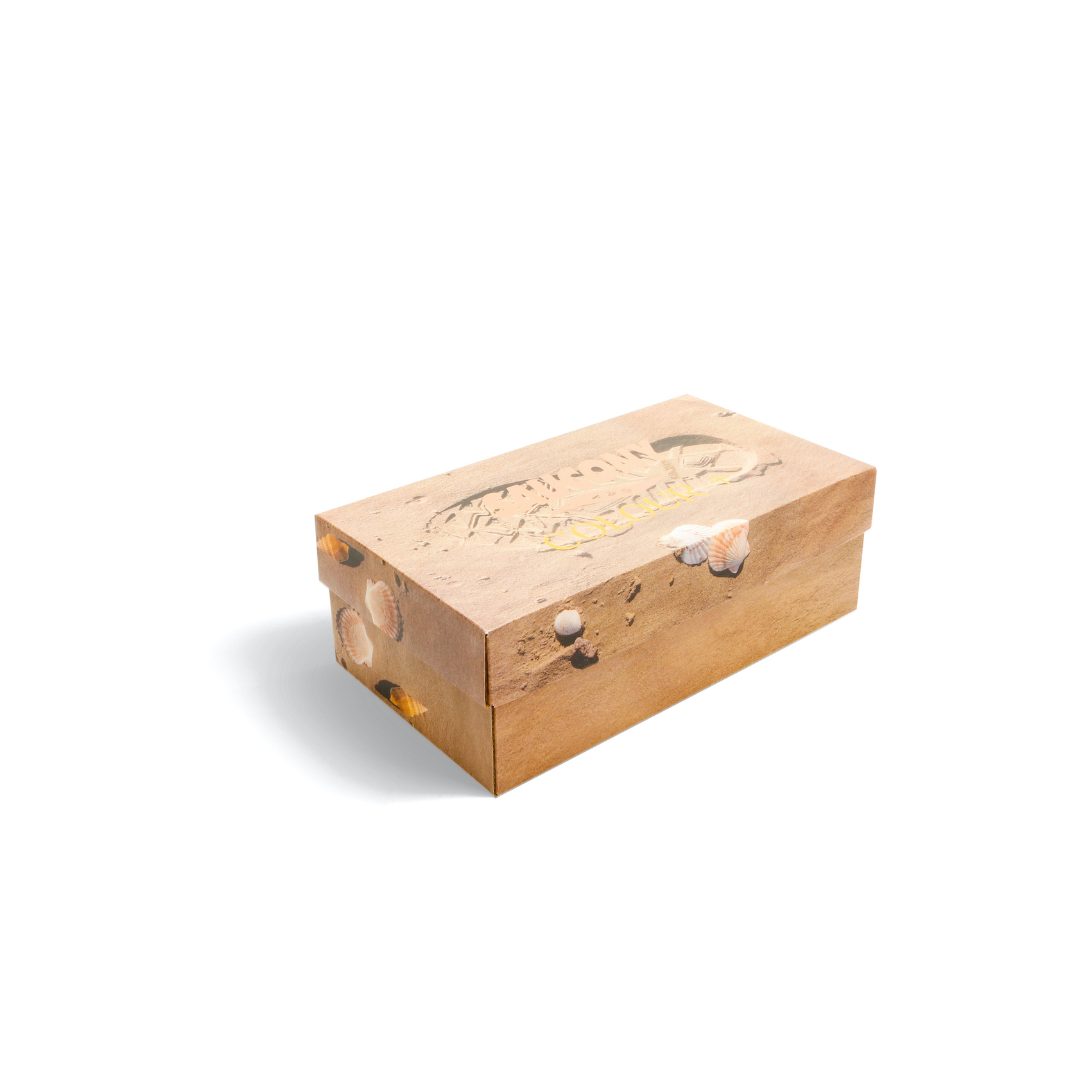 Un tocco di maestria è visibile nei dettagli che arricchiscono la “Beach Ramble”. La scarpa non è solo un accessorio, ma una storia raccontata attraverso piccoli elementi. L’impronta sulla sabbia, impressa con delicatezza sulla scarpa stessa, rievoca la magia di una passeggiata in riva al mare, mentre le conchiglie accuratamente raffigurate sulla shoe box personalizzata rafforzano il tema naturalistico scelto per questa creazione unica. È come se ogni passo preso con queste scarpe fosse un passo in una storia di connessione con la natura.